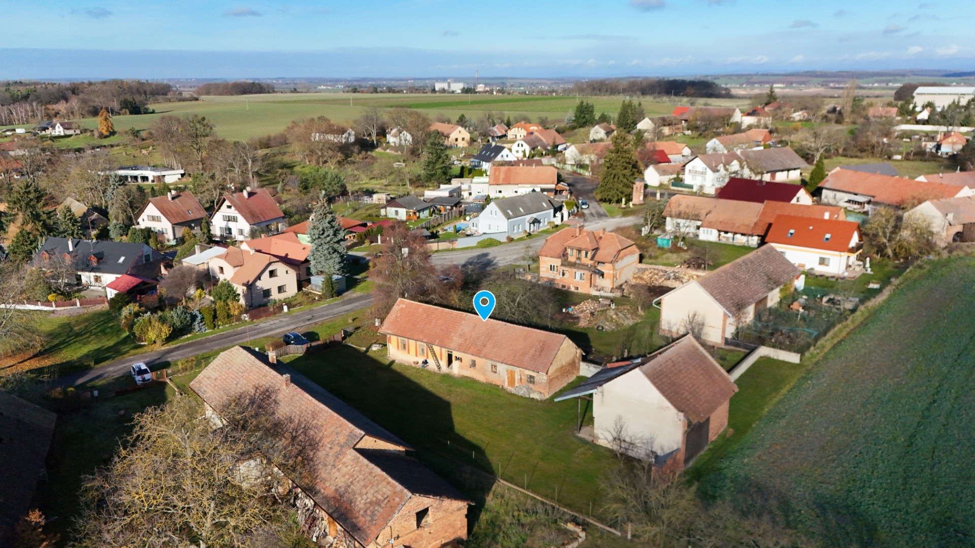 Polosamota a Soukromí: Umístění na konci obce (minimum sousedů, pozemek končí u volného pole).